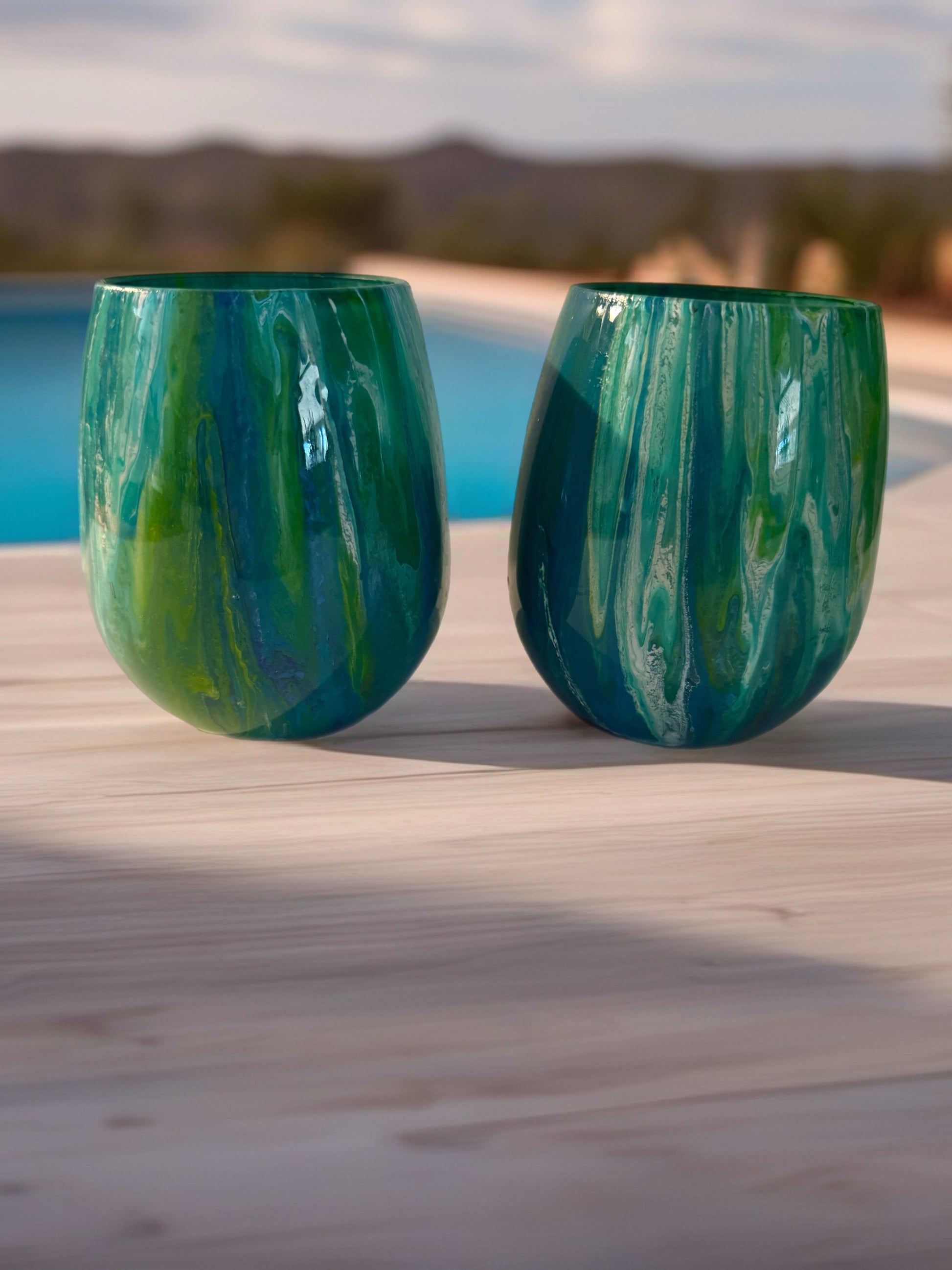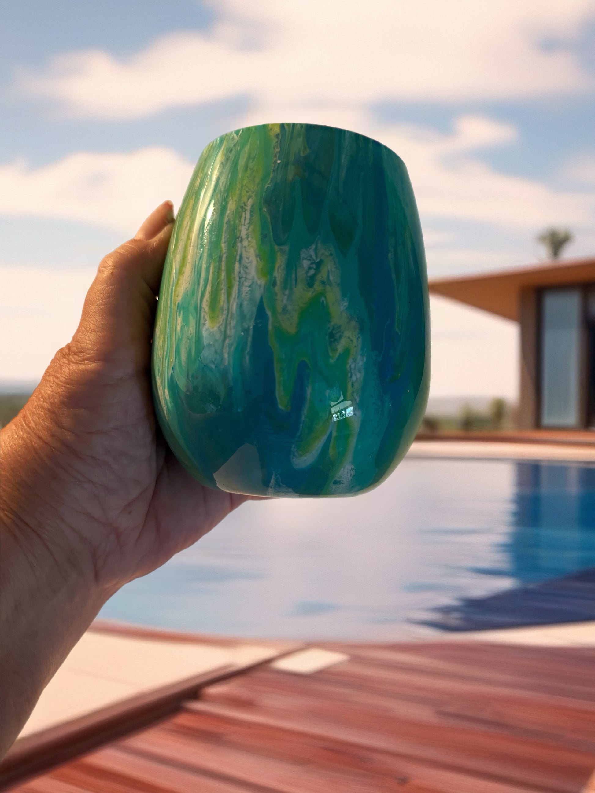 Infuse your outdoor moments with vibrant color and artisan charm. This hand‑painted acrylic wine glass features a flowing marbled blend of emerald green, ocean blue, and warm golden yellow, creating a luminous, nature‑inspired design that feels like sunlight dancing across water.