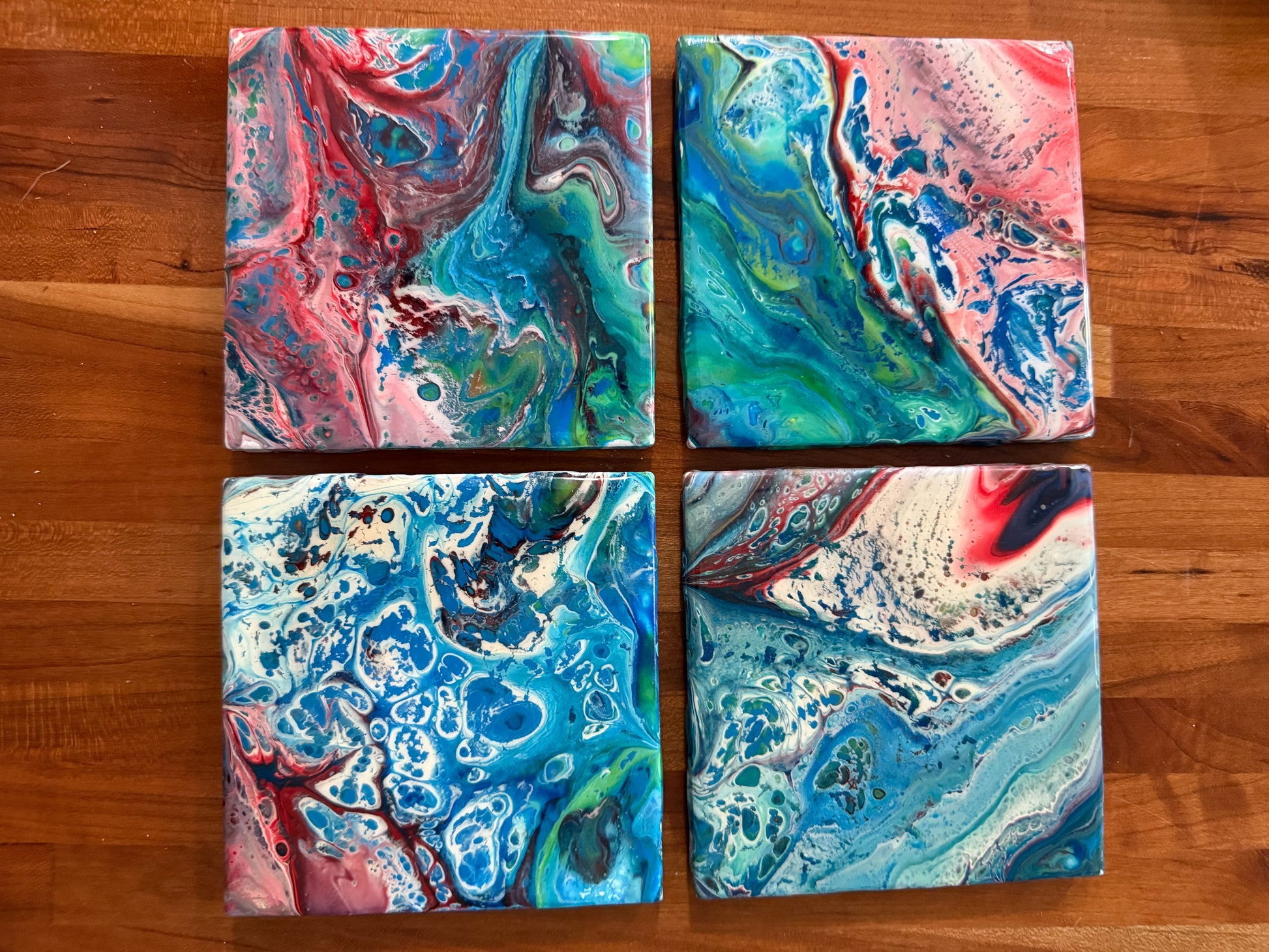 Protect your surfaces with a touch of fluid elegance. This handcrafted coaster set features a mesmerizing fluid-art design that turns every coffee break into a moment of art.