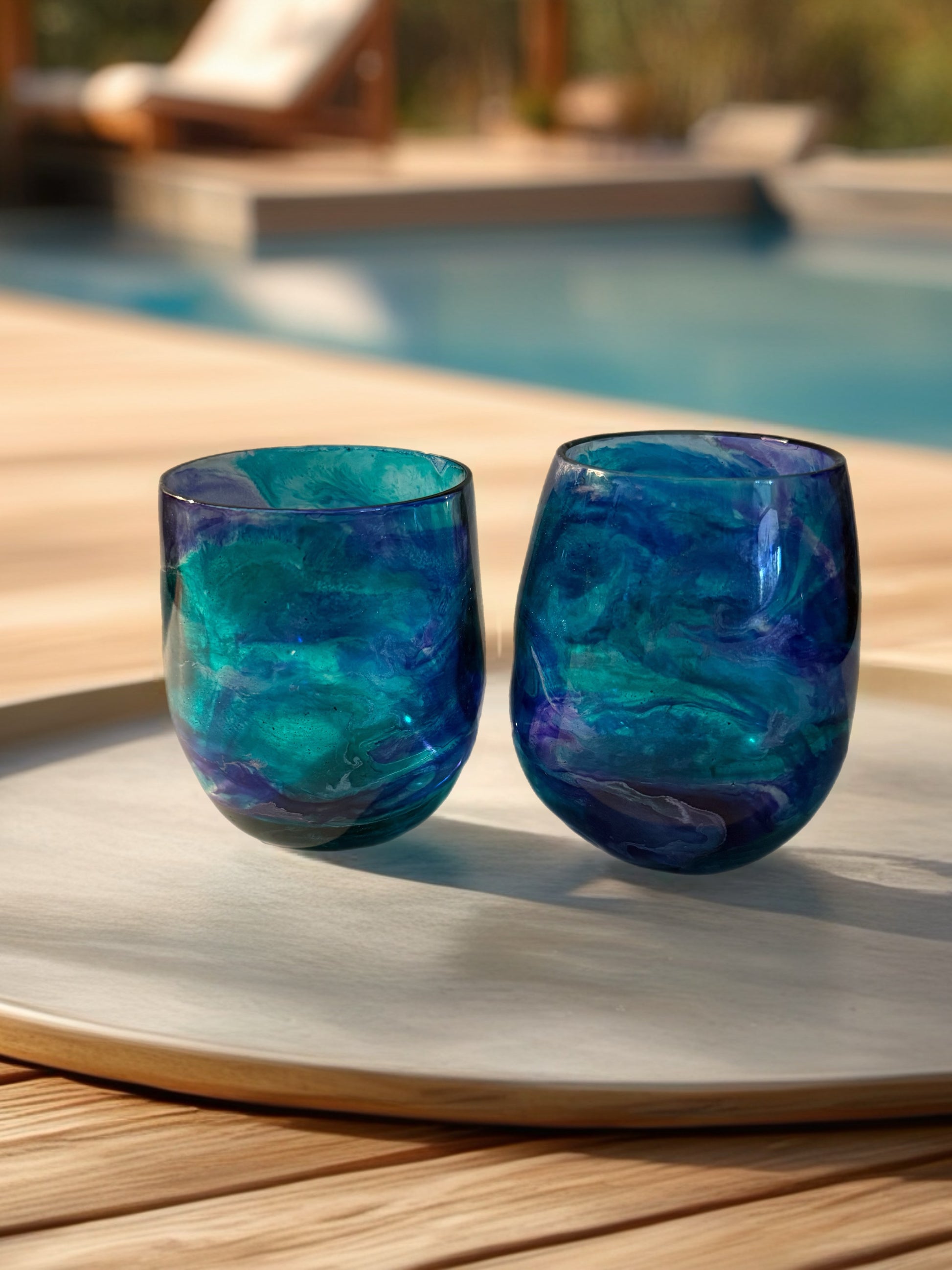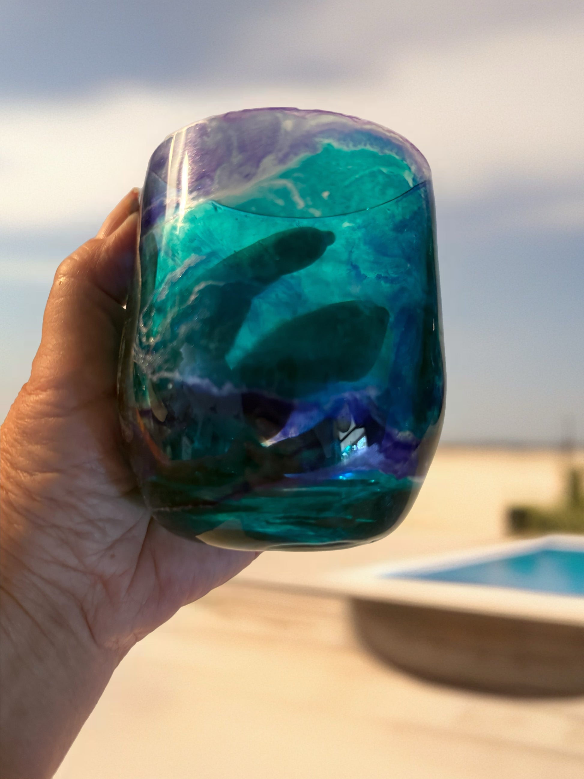 Elevate your outdoor sipping with this handcrafted acrylic wine glass, dressed in a swirling marbled palette of blue, teal, purple, and soft white. Each piece is individually hand‑painted, creating a fluid, ocean‑inspired design that feels like a tide captured in motion.
